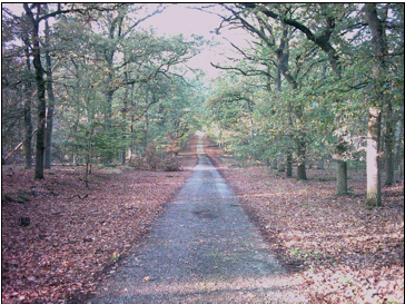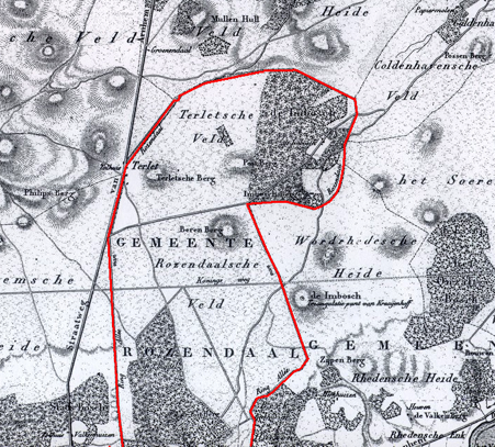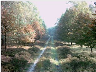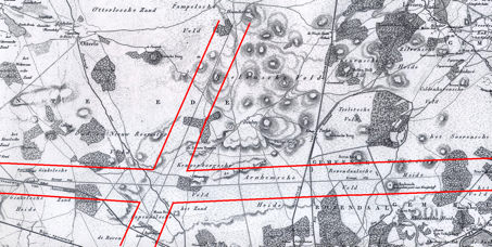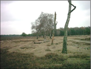 Fig. 138 De Deelenscheweg liep uit op de hei waar de militairen schietoefeningen hielden. Op deze afbeelding zijn in de verte de drie heuvels te zien die dienden als kogelvangers. Bron: (met toestemming heer van der Perk te Bilthoven).