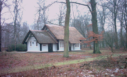 Fig. 140 Op deze afbeelding is het hutje van Van Maasdijk te zien. Het stond op het toen nog open terrein vlak achter de rentmeesterswoning. Het huisje werd het Maasdijkhutje genoemd en was een hokje van 1.5 á 2 meter in het vierkant met een op de foto zichtbare raampartij. Hoogstwaarschijnlijk is het hutje door Van Maasdijk gebruikt om zich om te kleden. Bron: (met toestemming heer van der Perk te Bilthoven).