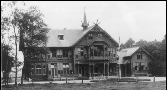Fig. 152 Het pomphuisje en de chauffeurswoning op het tegenwoordige vakantiepark Petersburg. Links van de woning stond de 30 meter hoge watertoren. Vergelijk de afbeelding met die van figuur 144.