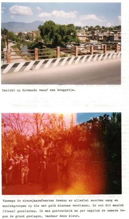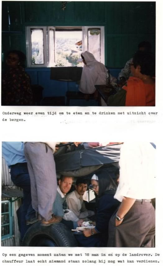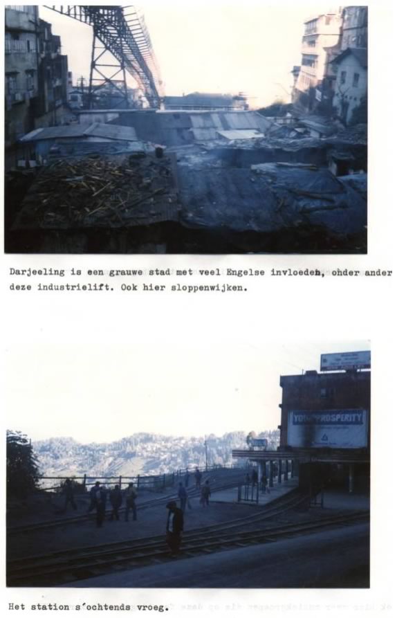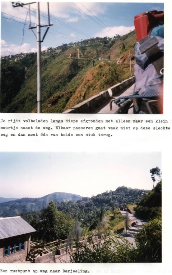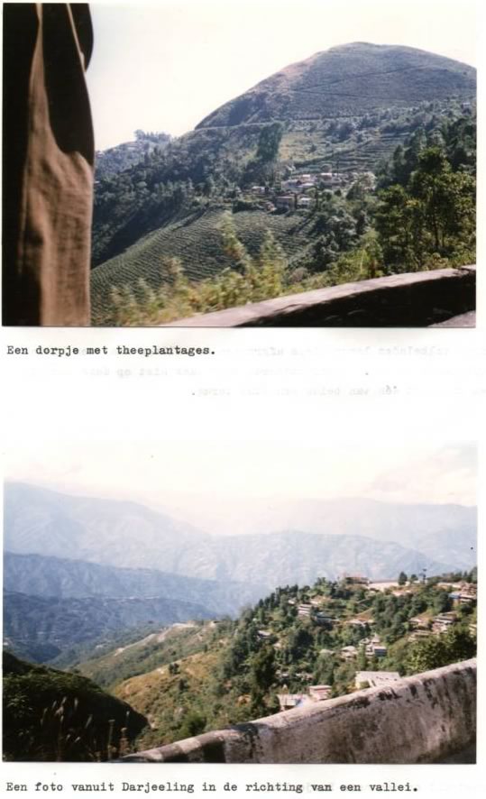 De grens met India weer overgetrokken en met een landrover naar Darjeeling gegaan (de weg was te slecht en te smal voor een gewone bus). De stad ligt op 2100 meter hoogte en eromheen zijn prachtige pijnbomen en theeplantages. In de verte zie je toppen liggen van meer dan 8000 meter hoog. De weg kronkelde helemaal mee met de befaamde door de Engelsen aangelegde Darjeeling spoorbaan met zijn vele bruggetjes en in lussen gelegde rails.