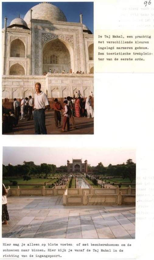 In Agra aangekomen en daar stromen de tuk-tuk rijders je ook al tegemoet. Ik had niet veel tijd want het bleek dat als je na 16.00 uur bij de Taj Mahal aankomt de entreeprijs wordt verhoogd van 15 tot 115 roepies, dit i.v.m. de zonsondergang die mooi te zien zou zijn op dit gebouw. Ik moet zeggen, zelden heb ik zo’n mooi gebouw gezien, werkelijk prachtig. Het is in de 17de eeuw gebouwd door een maharadja wiens vrouw op 37 jarige leeftijd overleed bij de geboorte van haar 14de!! kind. De maharadja was zo gek op zijn vrouw dat hij dit gebouw ter ere van haar hier neerzette en waarin ze was begraven. Ik zei was, want de sarcofaag waarin ze lag is gestolen en nu staat er