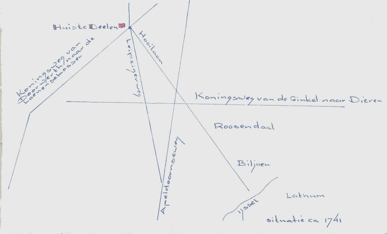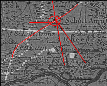 Fig.2 De doorgetrokken wegen komen allen bij het Huis te Deelen uit.
