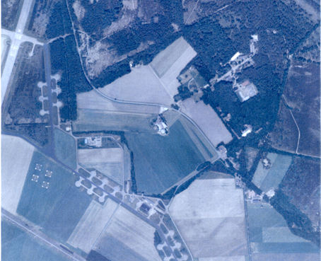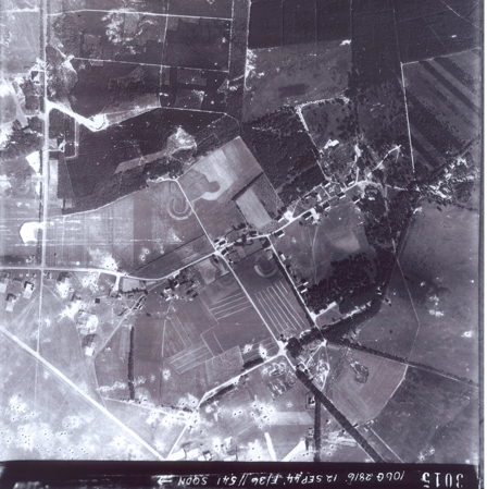 Fig. 55 Op 12 september 1944 werd deze luchtfoto gemaakt van Deelen. Er zijn veel bomin-slagen op het vliegveld te zien. Op deze luchtfoto bemerkte men voor het eerst de cropmarks (te zien als ronde en halfronde figuren in het midden van de foto). Bron: Gelders Archief. WO II. Map nr. 20 coll. 114 II serie I 23 – 33.